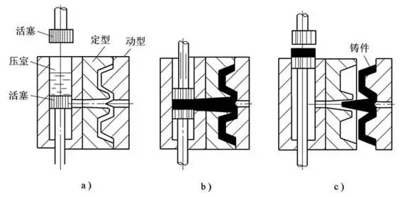 a)合型澆注 b) 壓射 c) 開(kāi)型頂件